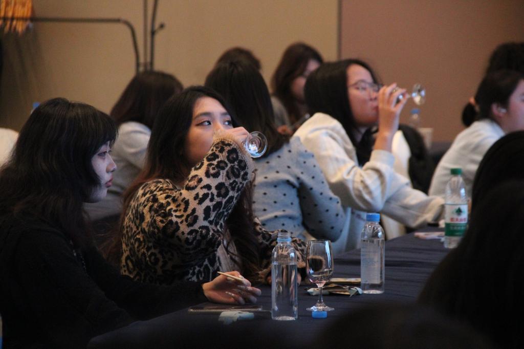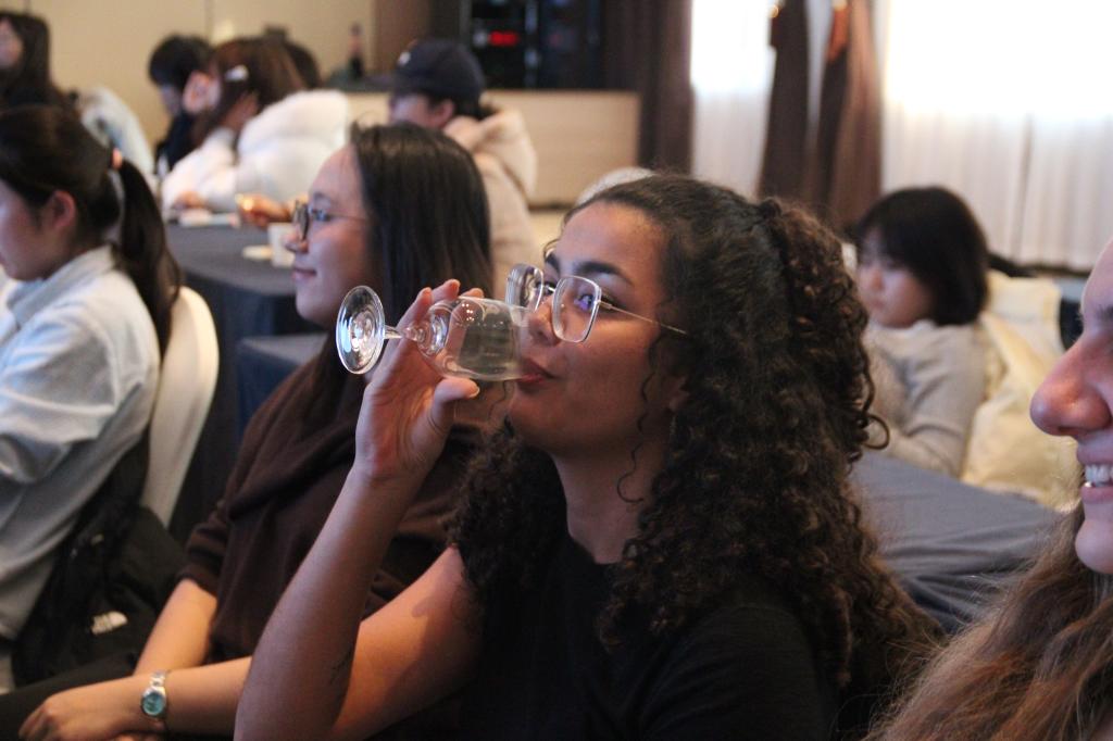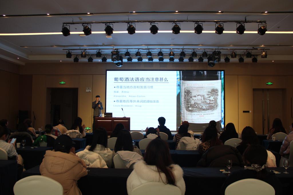 11月26日下午,系列活动的第二场——葡萄酒品鉴会优雅开启。特邀嘉宾金牌讲师王瑾作为主讲人,学院师生50余人共同参与。活动现场化身为一个微缩的法国酒庄,老师们向同学们详细介绍了法国葡萄酒的历史,细致讲解了法国主要葡萄酒产区的风土特点、品酒的基本礼仪以及餐酒搭配的学问,引领同学们步入葡萄酒的奇妙世界。从观色、闻香到品味,同学们轻摇杯盏,于晶莹的液体中辨识果香、木香与矿物气息的层次,感受舌尖上微妙的单宁与酸度的平衡,知识也在酒香中传递。