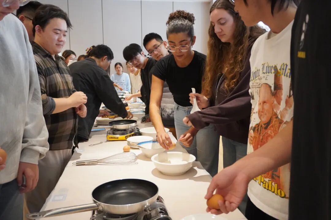 初冬的校园,空气中不仅弥漫着书香,更增添了一抹来自法兰西的甜蜜与醇香。11月12日下午,国际交流中心暖意融融,香气四溢,可丽饼制作活动在此拉开帷幕。在外教老师们的悉心指导下,学生们兴致勃勃地投入了这道法式国民甜点的创作中。调和面糊、掌控火候、转动煎锅、轻盈翻面……每一个步骤都是一次新奇的文化触碰。平底锅仿佛成了画布,同学们手持锅柄,让淡黄色的面糊均匀铺开,绘出一个又一个完美的圆形。当第一片金黄油润的可丽饼成功出锅时,成功的喜悦与甜蜜的香气一同在空气中绽放。这不仅是厨艺的学习,更是手工艺精神的直观感悟,让法国的日常烟火,在东方校园里有了温暖的回响。