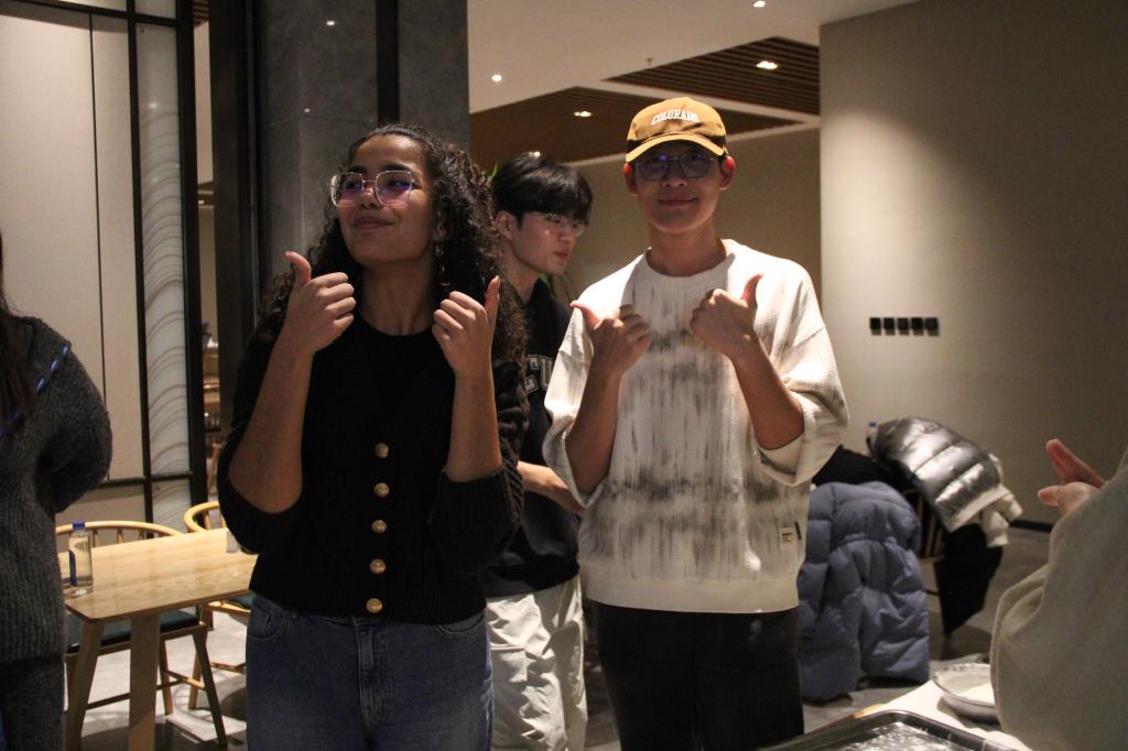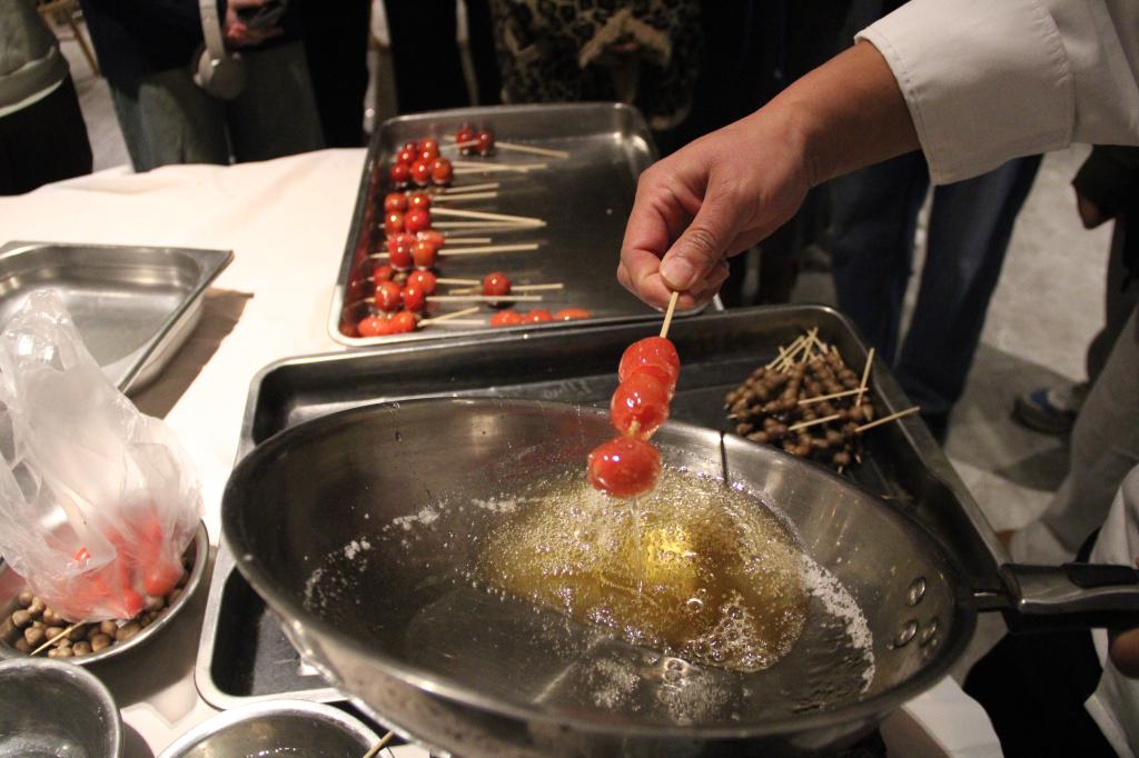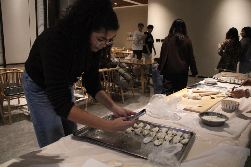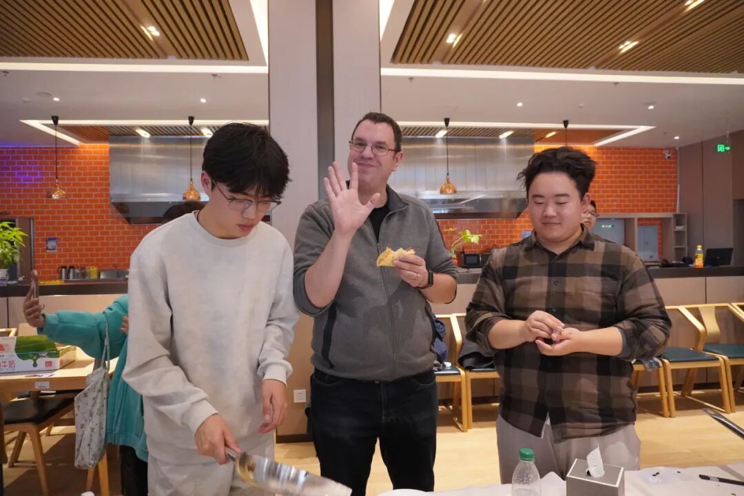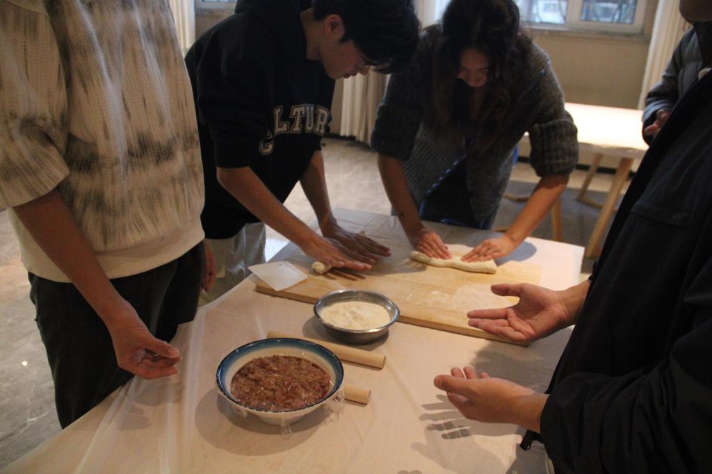 品鉴会过后,“中国传统美食制作”活动华丽登场。大家挽起衣袖,一同体验包饺子和制作糖葫芦的乐趣。擀皮、填馅、捏合,同学们交流着饺子的不同包法;熬糖、蘸果、冷却,一串串晶莹剔透、红艳诱人的冰糖葫芦在大家的协作下新鲜出炉。现场其乐融融,外教与学生们打破了身份界限,在共同的制作中亲密互动。同学们一边品鉴着手中各有风味的法国葡萄酒,一边品尝着美味的中国传统食物,实现了从“制作”到“鉴赏”的完整闭环。这一刻,美食与美酒不再是独立的个体,而是连接中法文化的桥梁。中外师生围聚一堂,就美食、文化、校园生活畅所欲言,味蕾上的极致体验成为了心灵沟通最直接的媒介。
