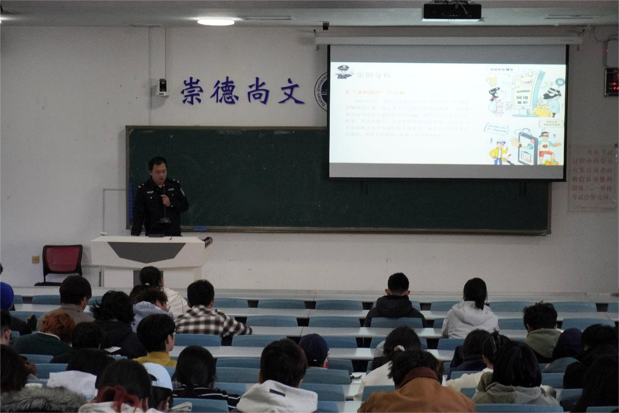 张警官也为同学们仔细地分析了电诈分子的作案手法与话术陷阱,利用生动有趣的科普视频,为大家提供了识别与防范电信诈骗的技巧,并强调,如果一旦遭受电信诈骗,大学生应当如何以求最大限度减少自身损失,引导同学们树立反诈意识,筑牢反诈安全防线。会场内,同学们全神贯注,认真聆听张警官的每一处讲解要点。