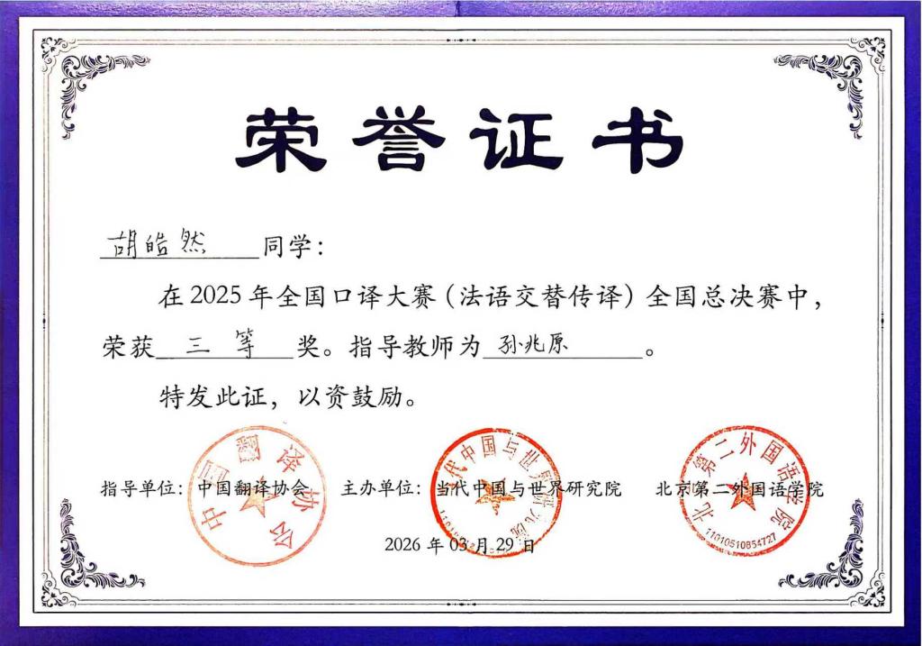 3月29日,2025年全国口译大赛法语组决赛在北京第二外国语学院举行。经过激烈角逐,大连外国语大学法语学院胡皓然凭借扎实的专业功底与稳定的赛场发挥,荣获法语交替传译组三等奖。